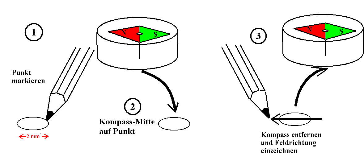 2. Damit ist auch eine Zweideutigkeit beseitigt. Stell' Dir vor, Du bringst eine Kompass-Nadel irgendwo zwischen die beiden Schenkel eines Hufeisenmagneten. Dann könntest Du meinen, dass der N-Pol der Nadel vom N-Pol des Magneten abgestoßen und vom S-Pol angezogen wird. Genauso könntest Du Dir vorstellen, dass der S-Pol der Nadel vom N-Pol des Magneten angezogen und vom S-Pol abgestoßen wird. Wirken also 4 Kräfte insgesamt auf die Magnetnadel? Keineswegs! Auf den N-Pol der Nadel wirkt das Magnetfeld mit einer einzigen Kraft, und auf den S-Pol wirkt das Magnetfeld mit einer einzigen Kraft.