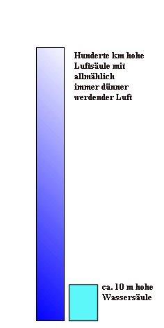 verglichen mit dem einer Wassersäule (türkis) Der Luftdruck auf Meereshöhe beträgt ca. 1000 hPa. |