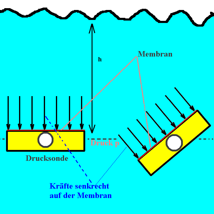 Bei gleichem Druck entstehen senkrecht zur Membran gleich große Kräfte, unabhängig von der Orientierung der Drucksonde. |