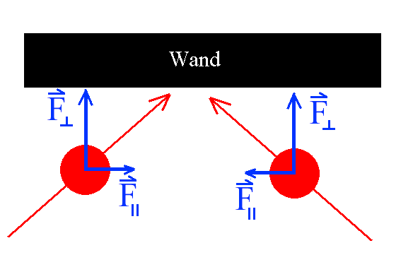 Abb. 3: Bei Wandstößen werden (zur Wand) senkrechte und parallele Kräfte übertragen. Im zeitlichen Mittel heben sich die parallelen aber gegenseitig auf. |
