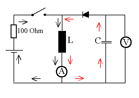 (Prinzipversuch) Abb. 6: Wenn der Schalter geschlossen wird, fließt Strom (schwarze Pfeile) und die Spule enthält magnetische Energie. Wird der Schalter wieder geöffnet, so muss (wegen Induktion) der Strom I unverändert weiter fließen (rote Pfeile). Er lädt dadurch einen Kondensator, dessen elektrische Energie anschließend durch die Spannung U gemessen wird. Es zeigt sich: Doppelte (3-fache) Stromstärke I führt zur doppelten (3-fachen) Ladespannung U, etc. Die magnetische Energie hängt genauso von der Stromstärke I ab, wie die elektrische Energie im Kondensator von dessen Ladespannung U, in beiden Fällen quadratisch. Also: Aus Eel prop. U2 folgt Emag prop I2. |