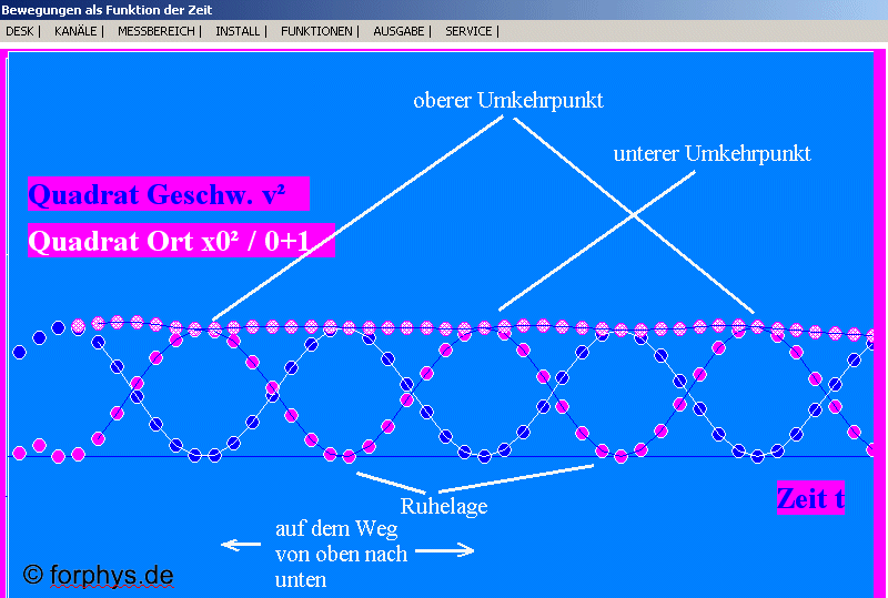 Geschwindigkeit und Auslenkung wurden hier quadriert und mit Faktoren versehen, die D/2 und m/2 entsprechen. Die beiden Kurven mit blauen Punkten und purpurnen Punkten stellen also Ekin und Esp in Abhängigkeit von der Zeit dar. Wenn du die blaue und die purpurne Kurve verfolgst, siehst du, dass sich kinetische und Spann-Energie ständig abwechseln. Das PC-Programm zeichnet auch noch die Summe beider Energien ein. Du siehst im Experiment, dass die Gesamtenergie hervorragend konstant ist: Beim Federpendel gilt der Energieerhaltungssatz in sehr guter Näherung. |