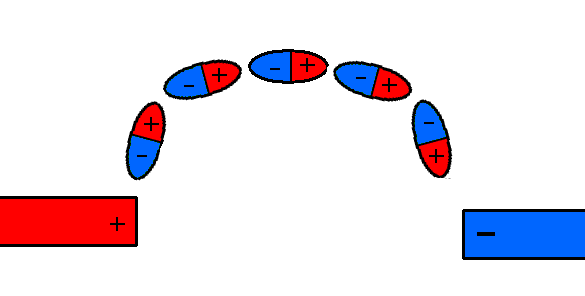 Bringt man in die Nähe eines positiv geladenen Körpers ein Stück eines Isolators (ein "Dielektrikum"), so findet in ihm keine Ladungstrennung statt, weil es in ihm keine frei beweglichen Elektronen gibt. Dagegen werden innerhalb der Moleküle des Dielektrikums negative Ladungen und positive Ladungen gegeneinander verschoben. An einer Seite des Moleküls wird ein positiver, an der anderen Seite ein negativer Ladungsschwerpunkt entstehen. Oder es werden Moleküle mit bereits vorhandenen getrennten Ladungsschwerpunkten gedreht, so dass der negative Ladungsschwerpunkt dem positiv geladenen Körper möglichst nahe, der positive Ladungsschwerpunkt möglichst fern ist. Beide Vorgänge werden Polarisation genannt. Da ungleichnamige Ladungen den kürzesten Abstand haben, überwiegt auch hier die Anziehungskraft.
