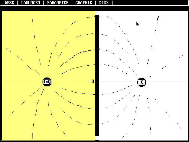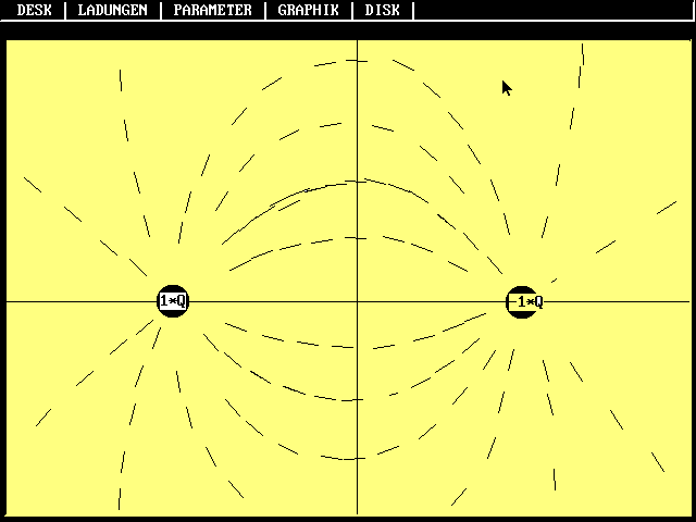 (Dieses Programm berechnet und überlagert für den Punkt an der Spitze des Mauszeigers die Coulombkräfte, die von den felderzeugenden Ladungen ausgehen, überlagert sie und stellt die Richtung der resultierenden Kraft fest. Diese entspricht der Tangente an die Feldlinie im betrachteten Punkt.) |