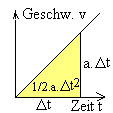 Versuchsweise wollen wir auch hier das Flächenverfahren einsetzen. Die Fläche unter dem t-v-Graphen ist hier eine Dreiecksfläche mit Grundlinie Δt und Höhe v = a.Δt. Der Fläche entspricht also 1/2·a·Δt2, und das soll versuchsweise die Ortsänderung in diesem Zeitintervall sein: Also