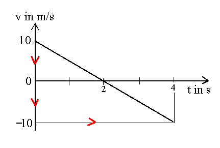 Im Zeitabschnitt Δt = 2 s nimmt die Geschwindigkeit von 10 m/s auf 0 m/s ab. Die Geschwindigkeitsänderung ist also Δv = - 10 m/s. Daraus folgt eine Beschleunigung a = Δv/Δt = - 10 m/s / 2 s = - 5 m/s2. Du hättest auch ein anderes Steigungsdreieck verwenden können, z.B. das mit Δt = 4 s. Hier liest du aus der Zeichnung ab: Δv = - 20 m/s (Beachte die Richtung der Pfeile im Vergleich zu den Koordinatenrichtungen!). Es folgt die gleiche negative Beschleunigung a = - 5 m/s2. Dass sie überall negativ sein muss, erkennst du daran, dass die Geschwindigkeit immer abnimmt, wobei aber das Fahrzeug zunächst bis zum Stillstand abgebremst wird (zur Zeit 2 s). Dann wird das Fahrzeug wieder schneller und erreicht schließlich bei t = 4 s sein größtes Tempo, aber die kleinste Geschwindigkeit. |