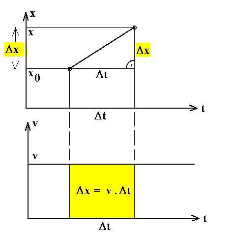 Bei einer gleichförmigen Bewegung ist die Geschwindigkeit konstant. Das t-v-Diagramm ist also eine Parallele zur Zeitachse. Wenn du dir ein Zeitintervall Δt herausgreifst, kannst du mit Δx = v·Δt die Ortsänderung in diesem Zeitintervall berechnen. v·Δt entspricht aber der Rechtecks-Fläche unter dem t-v-Graphen mit den Seitenlängen Δt und v. Wenn du also von der Geschwindigkeit zum Ort am Ende des Zeitintervalls Δt kommen möchtest, nimmst du die Fläche unter dem t-v-Graphen als Maß für die Ortsänderung Δx. Um den Ort x am Ende des Zeitintervalls zu erhalten, brauchst du nur zu der Ortsänderung den Ort x0 zu Beginn des Zeitintervalls, den Anfangsort, hinzu addieren: