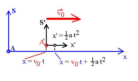 Bewegt sich der Wagen mit dem auf ihm befestigten Koordinatensystem S' jetzt aber in einem Koordinatensystem S mit konstanter Geschwindigkeit v0, bewegt sich A' gemäß v0.t. Die Koordinate des Körpers K in diesem System S ist also x = v0·t + x'. Eventuell kommt noch x0 hinzu, wenn sich A' zur Zeit t = 0 im Koordinatensystem S am Ort x = x0 befand. Also: