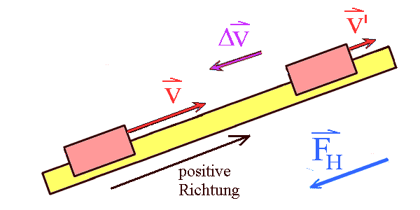 Der Vektor der Geschwindigkeitsänderung Δv ist hier in negative Richtung, also hangabwärts orientiert. Die Beschleunigung a ist negativ. Man sagt, die Beschleunigung erfolgt hier hangabwärts, ist hier hangabwärts gerichtet. In beiden Fällen sind der Vektor der Geschwindigkeitsänderung Δv und der Kraftvektor FH gleich gerichtet. |