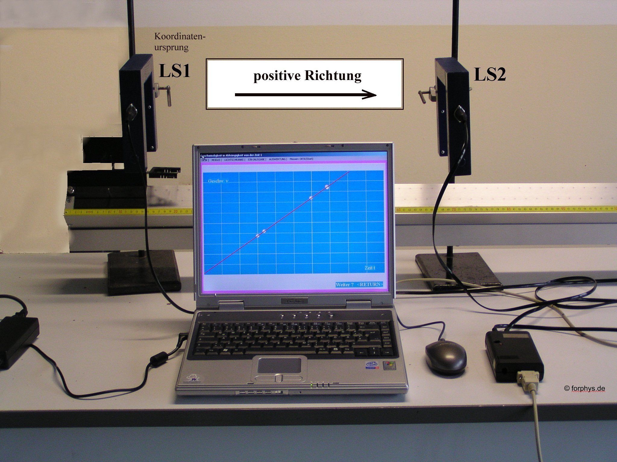 Für das Folgende wird eine eindimensionale Bewegung längs einer x-Achse vorausgesetzt. D.h. vor dem Versuchsbeginn wird ein Koordinatensystem so gewählt, dass die x-Richtung mit der Bewegungsrichtung übereinstimmt. Es muss eindeutig vereinbart sein, was die positive (x-)Richtung ist. Auf den Koordinatenursprung kommt es hier zunächst weniger an.