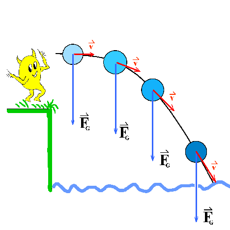 Der Anteil der Geschwindigkeit in horizontale Richtung bleibt unverändert, weil es keinen horizontalen Kraftanteil gibt. Es gibt hingegen eine Geschwindigkeitsänderung in Richtung der Gewichtskraft, also in vertikale Richtung: Der fallende Körper wird in vertikale Richtung (senkrecht nach unten) beschleunigt. |