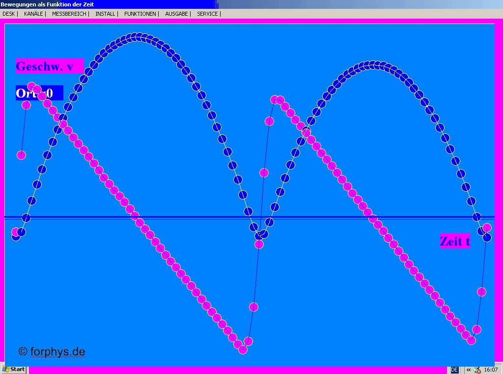 Der Gleiter wurde offenbar mit großer Geschwindigkeit nach oben geschossen. Dann nahm seine Geschwindigkeit bis zum Stillstand (Scheitel im t-x-Diagramm) ab. Sodann kehrte der Gleiter seine Bewegungsrichtung um (bewegte sich also nach unten); deswegen wurde die Geschwindigkeit negativ, wobei ihr Betrag (das Tempo) nach und nach wuchs. Beim Aufprall auf die Prallfeder unten war der Gleiter wieder am schnellsten (wie beim Start) und wurde dann wieder nach oben katapultiert. Während der Abwärtsbewegung wurde die negative Geschwindigkeit immer kleiner, das Tempo immer größer. |
