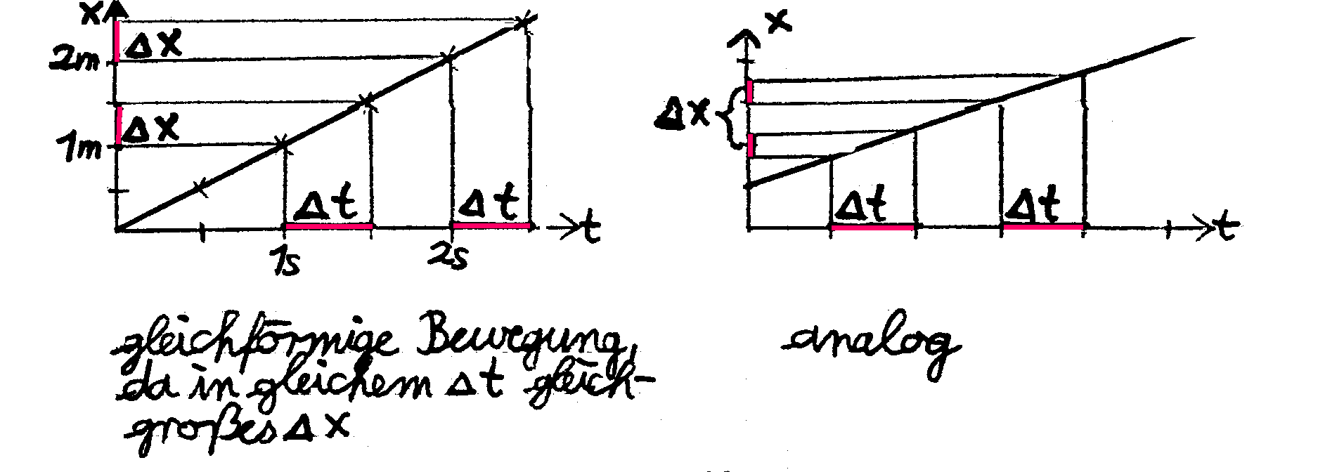 Im Folgenden werden für verschiedene Bewegungen die Ortsänderungen Dx in aufeinander folgenden, aber jeweils gleich großen Zeitabschnitten Δt untersucht. Die Zeichnungen stammen aus einem Schülerheft.