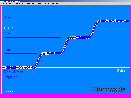 Anfänglich ruhte der Schüler im Koordinatenursprung. Dann bewegte er sich "gleichförmig" (mit konstanter Geschwindigkeit) zu einem bestimmten Ort und blieb dort wieder eine Zeitlang in Ruhe. Anschließend bewegte er sich "gleichförmig" rückwärts zum Koordinatenursprung und sogar über ihn hinaus bis zu einem negativen Ort, an dem er in Ruhe bleibt. |