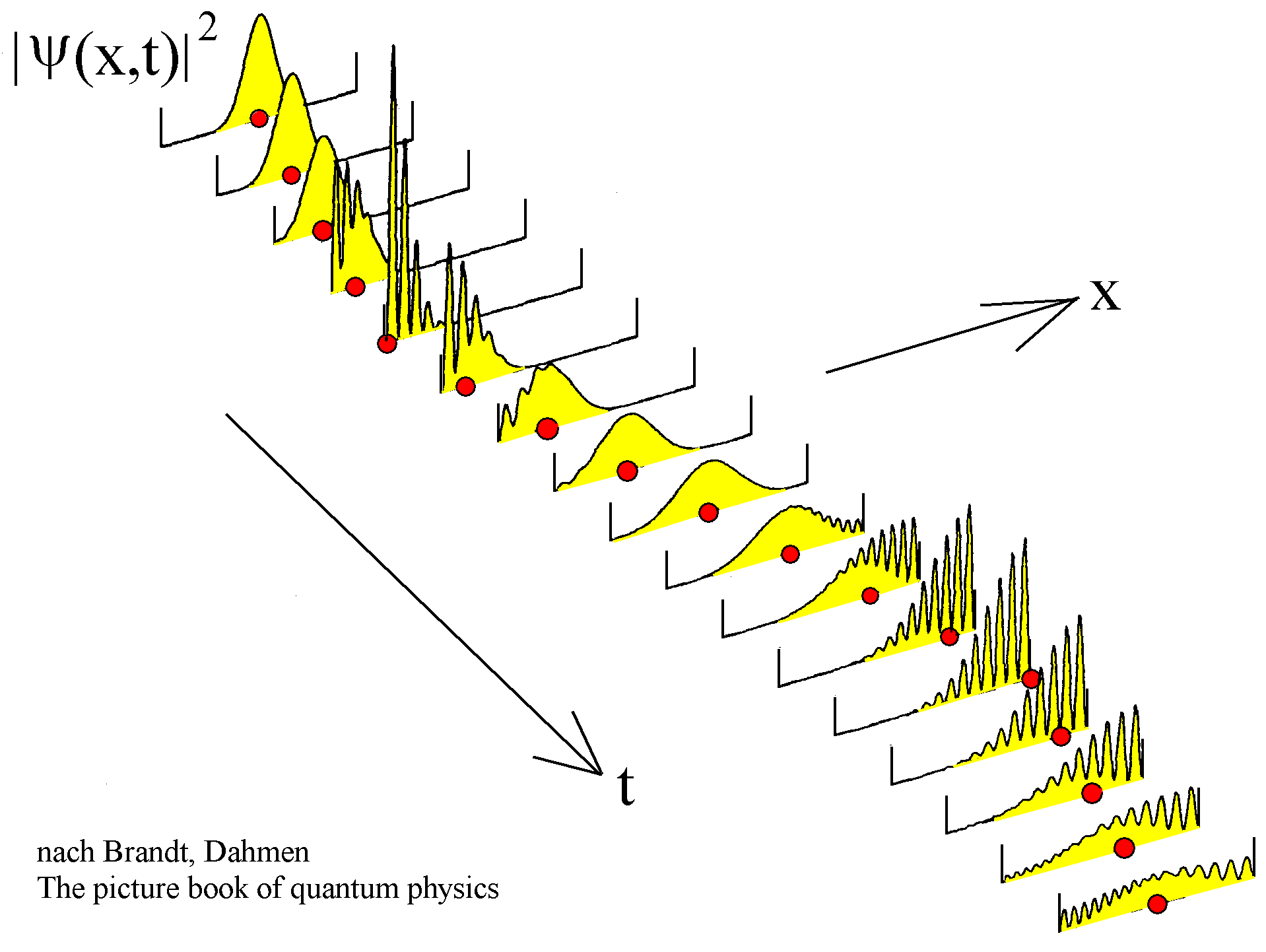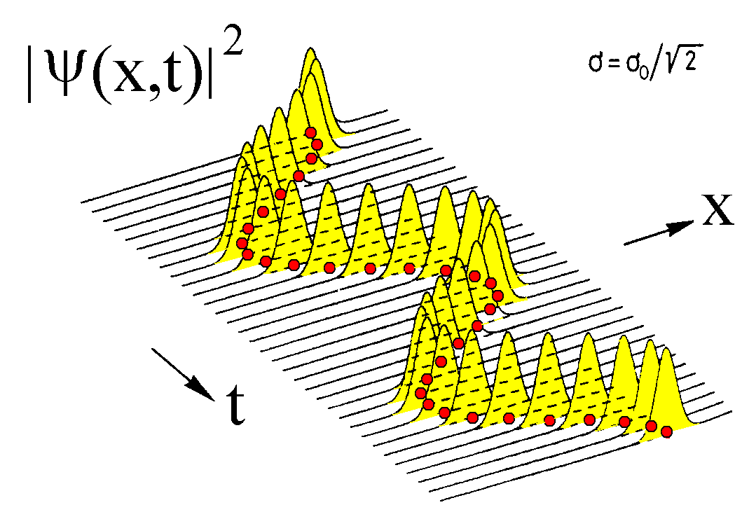 (1) Betrachte die Abbildung links. Hier ist die Wahrscheinlichkeitsdichte für ein sich kräftefrei nach rechts bewegendes Quantenteilchen dargestellt, also die Wahrscheinlichkeit, den Ort des Quantenteilchens in einem engen Bereich um den Wert x zu finden. Die Situation könnte einem Elektron in einer Oszilloskopröhre entsprechen, das sich nach der Beschleunigung kräftefrei auf den Bildschirm zu bewegt. Zunächst sieht das wie eine halbwegs gute Wahrscheinlickeitsverteilung für ein klassisches Teilchen aus: sie ist anfangs ziemlich konzentriert um den Ort des Teilchens. Der Zustand wurde auch so präpariert, dass die Geschwindigkeit nahe der des klassischen Teilchens zu finden ist. Man stellt fest: Der Mittelwert oder Erwartungswert2) bei Ortsmessungen - grob der Punkt mit größter Wahrscheinlichkeit, das Teilchen zu finden, bewegt sich mit der Geschwindigkeit des klassischen Teilchens. Genau das hat der österreichische Physiker Paul Ehrenfest 1927 mit dem nach ihm benannten Theorem für bestimmte Situationen behauptet. | |