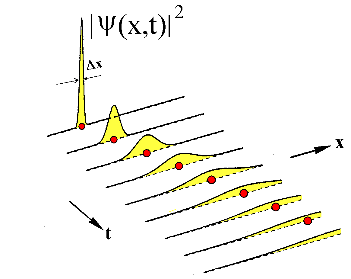 Ein solcher Zustand könnte durch ein recht eng begrenztes Wellenpaket für die Wellenfunktion beschrieben werden. Allerdings muss für diesen Zustand entsprechend der HUR *) ein Kompromiss zwischen den Streuungen Δx der Messwerte für den Ort und den Streuungen Δv der Messwerte für die Geschwindigkeit v gefunden werden. Die Breite des Wellenpaketes kann nicht zu gering gewählt werden, weil dann der Streubereich der Geschwindigkeitswerte zu groß wäre. Umgekehrt kann der Streubereich der Geschwindigkeit nicht zu klein gewählt werden, weil dann der Streubereich der Ortswerte zu groß wäre. Nehmen wir an, es sei uns gelungen, das Quantenteilchen in einen solchen geeigneten Zustand zu präparieren.