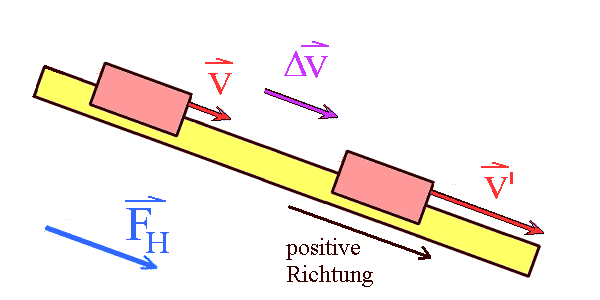In der vektoriellen Form steckt zusätzlich noch die Aussage, dass Kraft F und Beschleunigung a immer gleichgerichtet sind. Das hattest du auch schon mittels der folgenden Zeichnung an der schiefen Ebene kennen gelernt: Durch die Hangabtriebskraft wird der Wagen hangabwärts beschleunigt. Die Richtung des Beschleunigungsvektors a ist hier durch Δv eingetragen. |