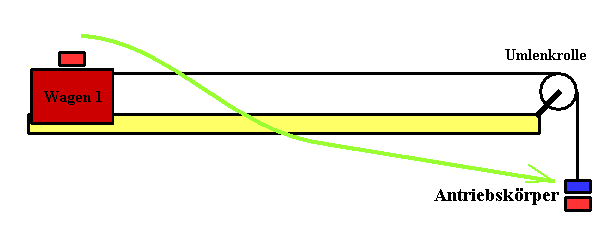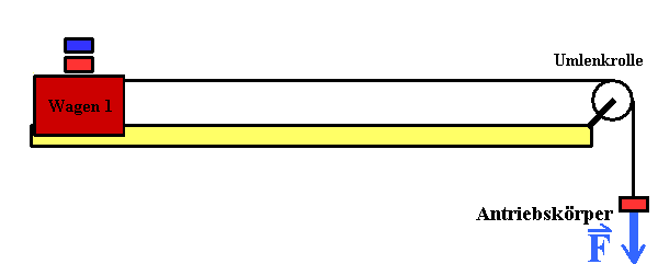 Als Antriebskraft F wird die Gewichtskraft auf einen Antriebskörper verwendet. Es wird sowohl der Wagen als auch der Antriebskörper beschleunigt. Die Masse, die hier eingeht, ist die gesamte Masse m, die beschleunigt wird. Sie wird Gesamtmasse m genannt. Damit die Masse bei Verdoppelung, Verdreifachung, ... der Antriebskraft konstant bleibt, müssen die Antriebskörper aus einem Vorrat auf dem Wagen genommen werden. (Ein Körper mit der Gesamtmasse m wird beschleunigt. Eine einzige Kraft wirkt als Ursache der Beschleunigung, nämlich die Gewichtskraft auf den Antriebskörper der Masse Δm. Reibung, Fadenmasse und "innere" Kräfte sind vernachlässigbar.) |