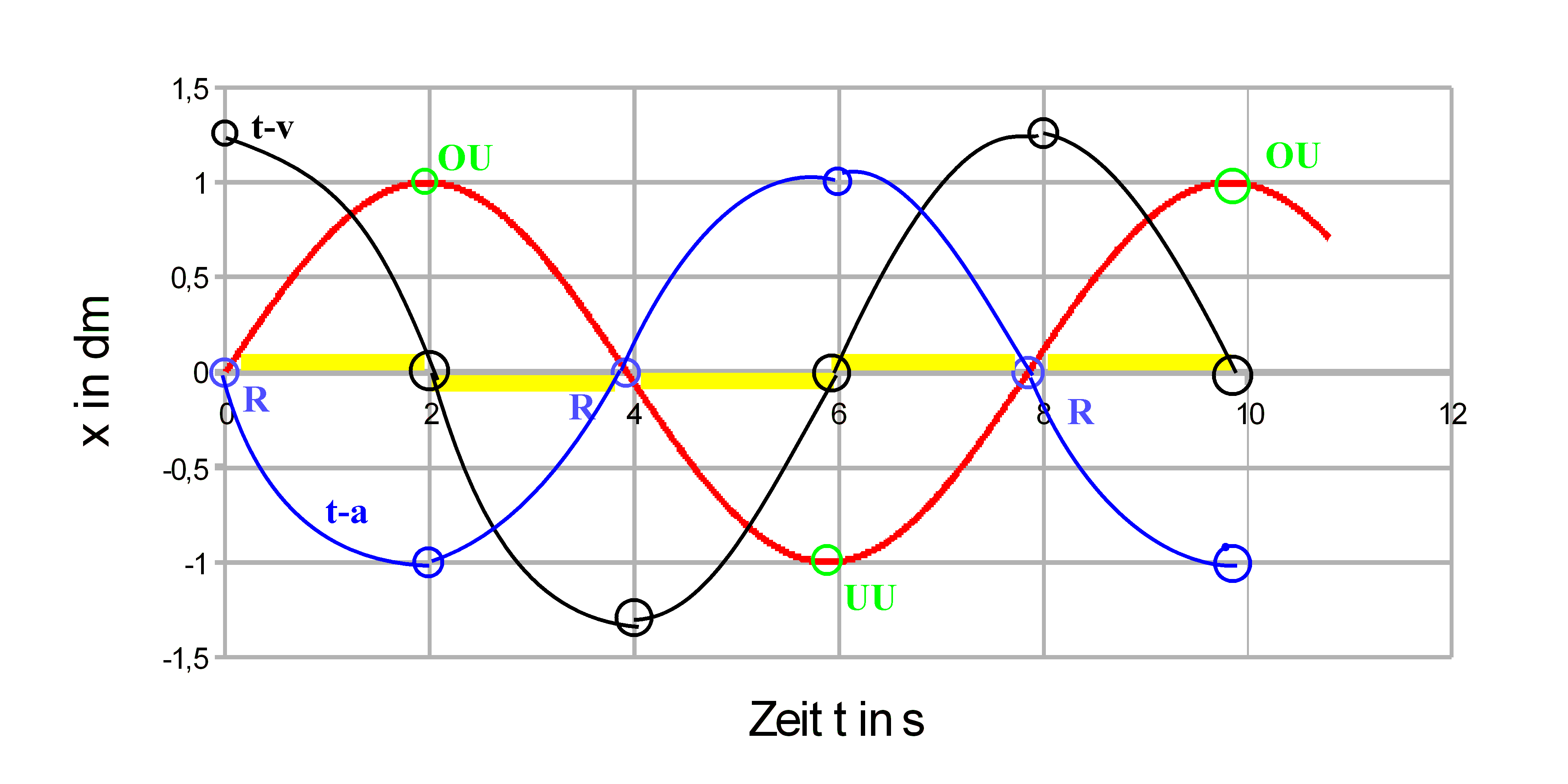 Du solltest auf jeden Fall herausbekommen haben, dass das t-x- und das t-a-Diagramm im Wesentlichen "gegenphasig" verlaufen.