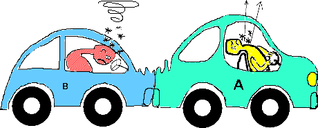 Ein schnell fahrender Autofahrer übersieht das Stauende und fährt ungebremst auf den letzten PKW des Staus auf. Es entstehen typische Verletzungen: Der Fahrer des urspünglich stehenden PKWs (A) verletzt seine Halswirbelsäule (Gefahr des Schleudertraumas). Der Kopf des Fahrers vom urspünglich fahrenden PKW (B) wird gegen die Windschutzscheibe geschleudert (Gefahr des Schädelbruchs). Bei beiden Verletzungsarten zeigen sich Folgen der Trägheit. Der Kopf von Fahrer A versucht, weiterhin in Ruhe zu bleiben, während der PKW unter ihm nach vorne gestoßen wird. Der Kopf von Fahrer A widersetzt sich einer Beschleunigung (einem Schnellerwerden). Der Kopf von Fahrer B versucht, weiterhin in Bewegung zu bleiben, während der PKW unter ihm schlagartig abgebremst wird. Der Kopf von Fahrer B widersetzt sich einem Abbremsen.