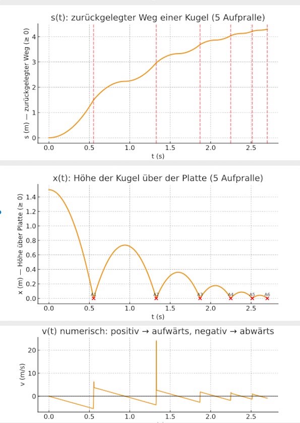 Die plötzliche Richtungsumkehr zu den Aufprallzeiten ist - modellbedingt - unphysikalisch. Deshalb sind dort im v(t)-Graphen unphysikalische vertikale Spitzen eingezeichnet. Das s(t)- und das x(t)-Diagramm weisen dort Knickstellen auf.