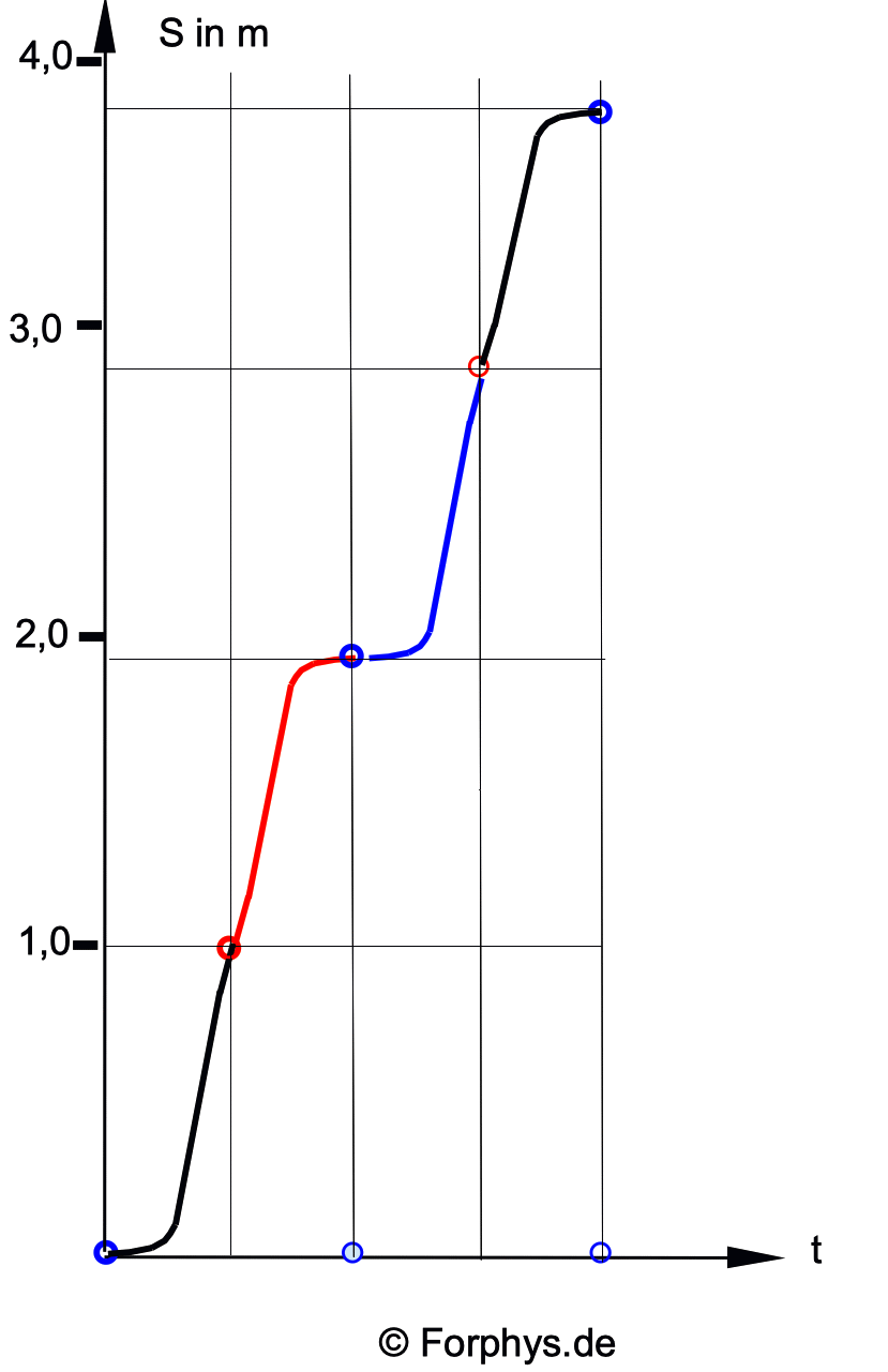 der Bewegung wächst stets, unabhängig von der Bewegungsrichtung. Blau sind wieder die oberen Umkehrpunkte, rot die unteren Reflexionspunkte. Siehst du, wie sich der t-s-Graph aus dem t-x-Graphen entwickelt? Die Farben sollen dir dabei helfen! Der zurückgelegte Weg s kann nie negativ sein und im Laufe der Zeit niemals kleiner werden. Aus der Steigung des t-s-Graphen kann man hier höchstens etwas über das Tempo ablesen, nicht über die Bewegungsrichtung und das Vorzeichen der Geschwindigkeit. |