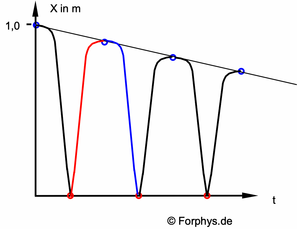 Es ist klar, dass die jeweiligen Orte x nur zwischen dem Startort und dem Reflexionsort auf der Platte variieren, also zwischen 0 und h. Auch ist klar, dass der zurückgelegte Weg s auch nach jeder Richtungsänderung weiter wächst. Ohne Energieverluste würde für jeden Abschnitt von oberem Umkehrpunkt über den Reflexionspunkt zum Wiedererreichen des oberen Umkehrpunkts jeweils der Weg 2·h zurückgelegt werden, bei n solchen Abschnitten also der Weg n·2·h (n = 1, 2, 3, ... ): der zurückgelegte Weg würde immer weiter anwachsen.