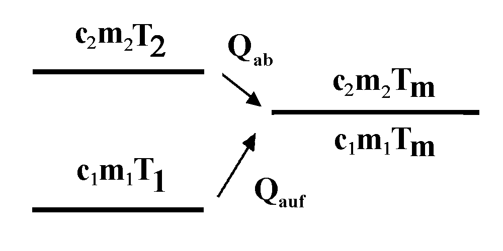 Bringt man einen Körper der Temperatur T1 in Kontakt mit einem Körper der höheren Temperatur T2, dann verliert der Körper mit der höheren Temperatur innere Energie. Er gibt also die Wärme Qab ab. Der kältere Körper nimmt im Idealfall diese Wärme (als Qauf) auf und erhöht damit seine innere Energie. In beiden Körpern bildet sich eine Mischungstemperatur Tm aus. Der kältere Körper erwärmt sich bis zur Mischungstemperatur, der wärmere Körper kühlt sich bis zur Mischungstemperatur Tm ab.