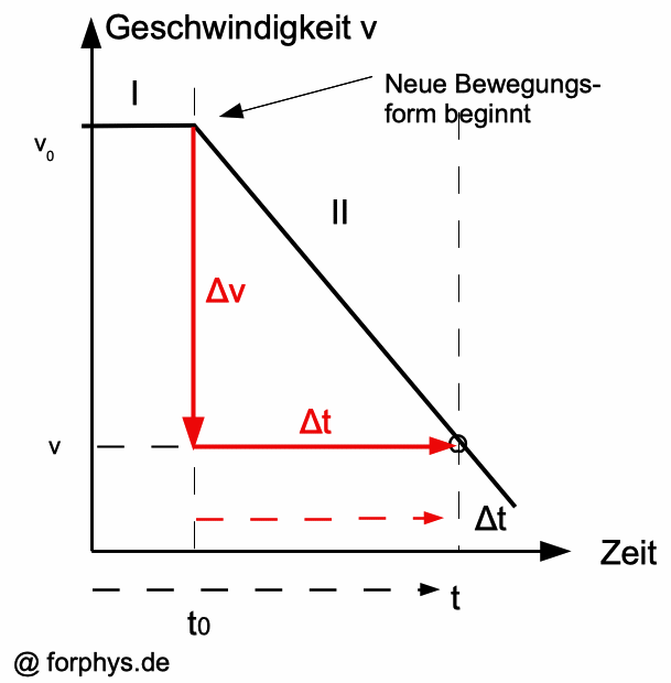 : Der markierte Punkt hat die Koordinaten (v;t). Er lässt sich auch durch den Zeitabschnitt Δt = t - t0 beschreiben. Wenn t > t0 , ist Δt > 0. Δv = v - v0 ist in diesem Zeitabschnitt negativ, also auch die Beschleunigung a = Δv/Δt. In Abschnitt I gilt: v = v0 = konst. , in Abschnitt II gilt: v = v0 + a·Δt = v0 + a·(t - t0). |