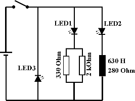 (Leuchtdiode LED1), der zweite Zweig eine große Spule (mit der