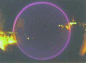 Wenn du nun ein Magnetfeld geeigneter Richtung anlegst, krümmt sich der Elektronenstrahl, im Idealfall zu einem Kreis. Das ist dann der Fall, wenn das Magnetfeld B senkrecht auf der Ebene des Elektronenstrahls steht. Der Radius r der Kreisbahn bei gegebener Elektronenenergie e·U und gegebenem Magnetfeld B verrät die spezifische Ladung.