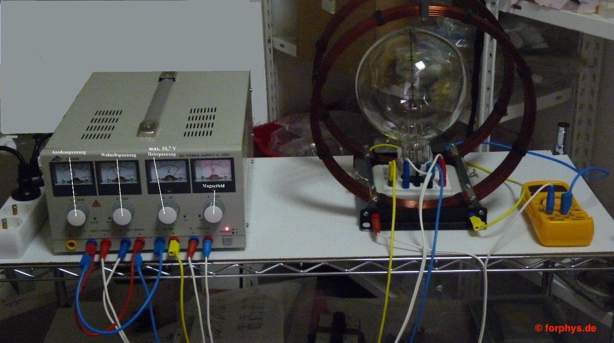 Im Fadenstrahlrohr (oder auch Wehnelt-Röhre) der Abb. 1 wird ein relativ scharf gebündelter Elektronenstrahl erzeugt, der zunächst geradlinig aus der Elektronenkanone austritt. Das Fadenstrahlrohr ist mit verdünntem Wasserstoff-Gas (mit einer kleinen Beimischung von Alkohol) gefüllt. Dadurch wird der Elektronenstrahl sichtbar. Die Elektronen bringen nämlich bei ihrem Durchtritt durch das Gas benachbarte Teile des Gases zu einem violetten Leuchten. Dabei werden die Elektronen an den Gasmolekülen etwas gestreut, der Strahl weitet sich auf und wird so um so deutlicher sichtbar.