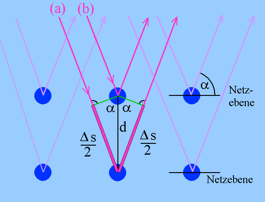 Es sieht dann so aus, als werde die Strahlung an den vielen parallelen Netzebenen reflektiert. Aber das geschieht eben nur für bestimmte Einfallswinkel α. Deswegen: